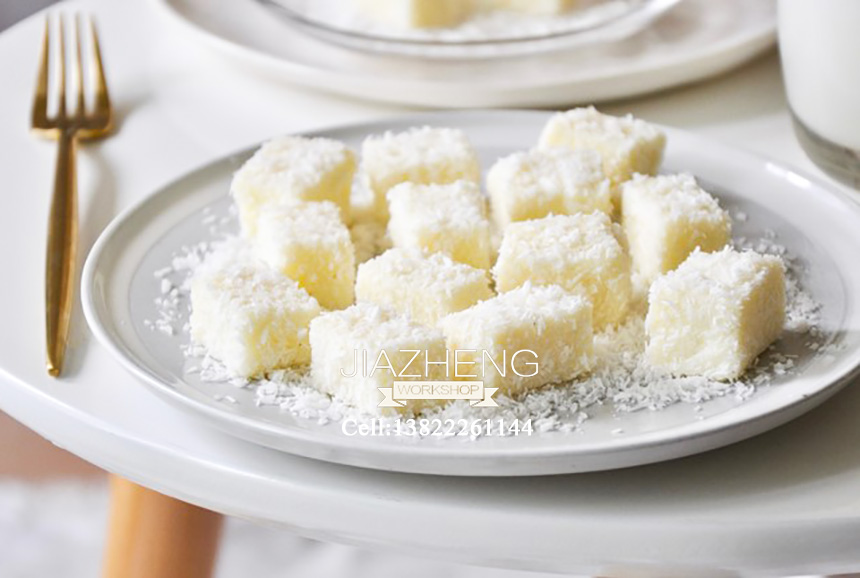 10.保鮮盒里放入切好的牛奶小方,再撒上適量椰蓉,蓋上蓋子搖晃均勻,讓牛奶小方四面都裹上一層椰蓉。